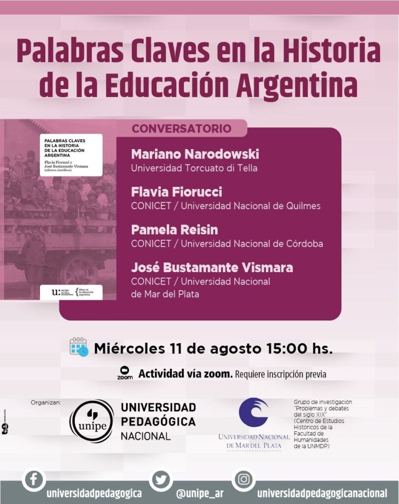 El miércoles 11 de agosto a las 15:00 horas, se realizará un conservatorio virtual a través de zoom sobre el libro “Palabras Claves en la Historia de la Educación Argentina” un compilado realizado por Flavia Fiorucci, integrante del CONICET en la Universidad Nacional de Quilmes. El principal objetivo es de dialogar sobre los desafíos que implicó la realización del libro y el impacto que ha tenido estos últimos meses. El mismo es de acceso libre y gratuito a través de la web de la UNIPE.