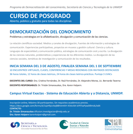 La Secretaría de Ciencia y Tecnología de la Univesidad Nacional de Mar del Plata a través de su programa Democratización del Conocimiento invita a participar del curso de posgrado «Democratización del conocimiento. Problemas y estrategias en la alfabetización, divulgación y comunicación de las ciencias».