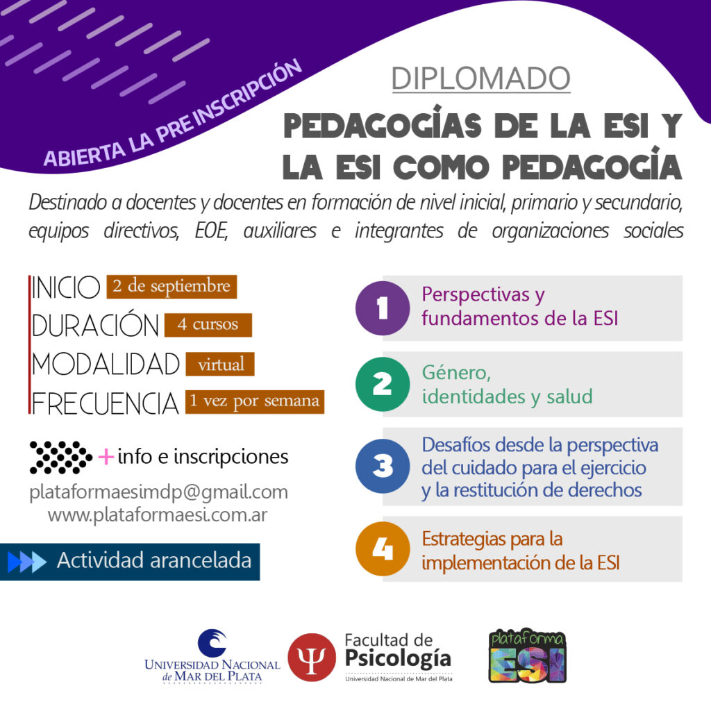 La propuesta llamada «Pedagogías de la ESI y la ESI como pedagogía» consiste en un diplomado de cursado virtual con una carga horaria de 92 horas, destinado a docentes, docentes en formación de nivel inicial, primario y secundario, equipos directivos, EOE, auxiliares e integrantes de organizaciones sociales. Iniciará el 2 de septiembre a través del campus virtual de la Facultad de Psicología y será de 18:00 a 20:30 horas.