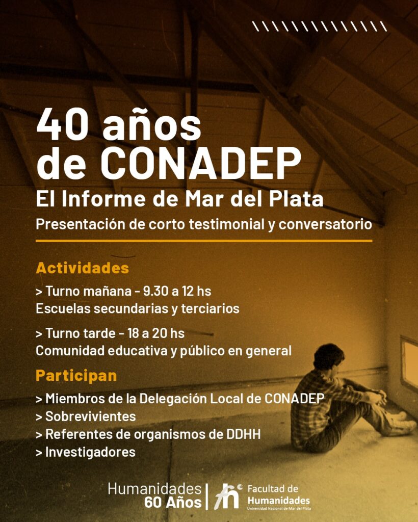 El encuentro contará con la proyección de un corto testimonial que recoge la palabra de integrantes de la Comisión Local de CONADEP y de sobrevivientes de los Centros Clandestinos de Detención que brindaron testimonio en el año 1984 sobre los crímenes de estado cometidos en el marco de la última dictadura cívico militar. Luego, seguirá un conversatorio en el que participarán miembros de la CONADEP, sobrevivientes de ex centros clandestinos de detención de Mar del Plata, el Espacio Faro de la Memoria, Autoridades de la UNMDP y de la Facultad de Humanidades.