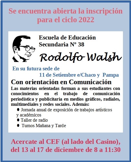 En las últimas horas se confirmó la fecha y el lugar de inscripción para aquellos interesados en ingresar a la Escuela Secundaria Nº 38 en su futura nueva sede ubicada en 11 de septiembre, entre Chaco y Pampa. La inscripción estará abierta entre los días 13 y 17 de diciembre, en la sede el CEF, a un lado del casino. El horario de atención para entregar la documentación pertinente será de 8:00 a 11:30 de la mañana.